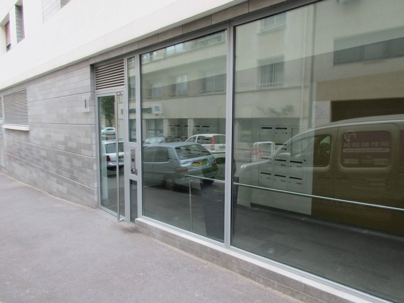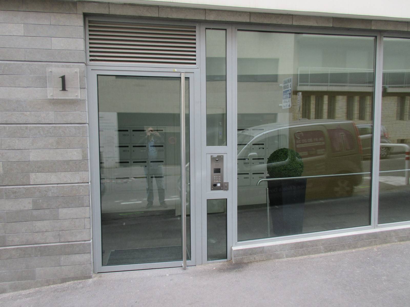Fourniture et pose d'une porte d'entrée d'immeuble Aluminium argent satiné à rupture de pont thermique avec châssis fixes et double vitrage sécurité.
