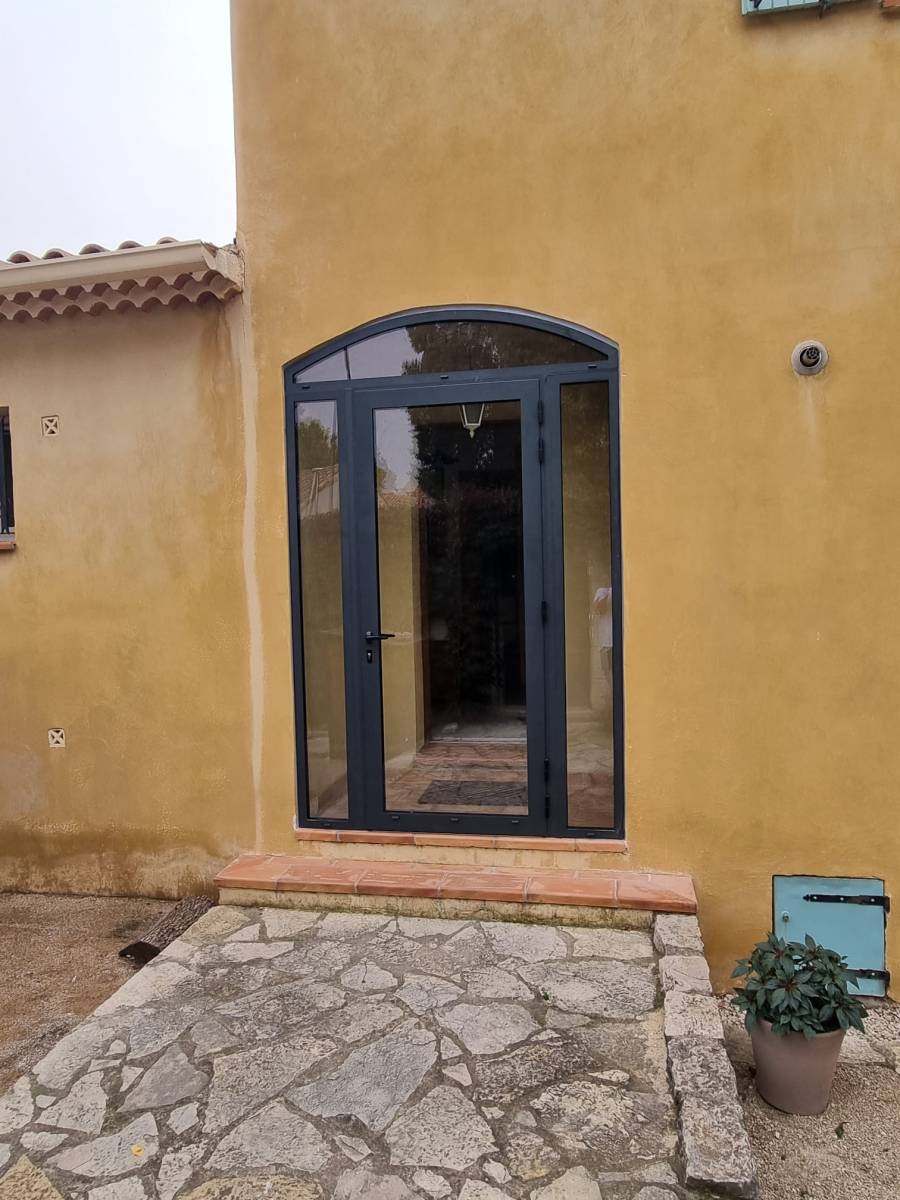 Nos clients ont choisi une nouvelle porte d'entrée vitrée en aluminium de couleur gris anthracite ral 7016, avec châssis fixe à droite, à gauche et cintré en haut de la porte pour plus de luminosité à l'intérieur.