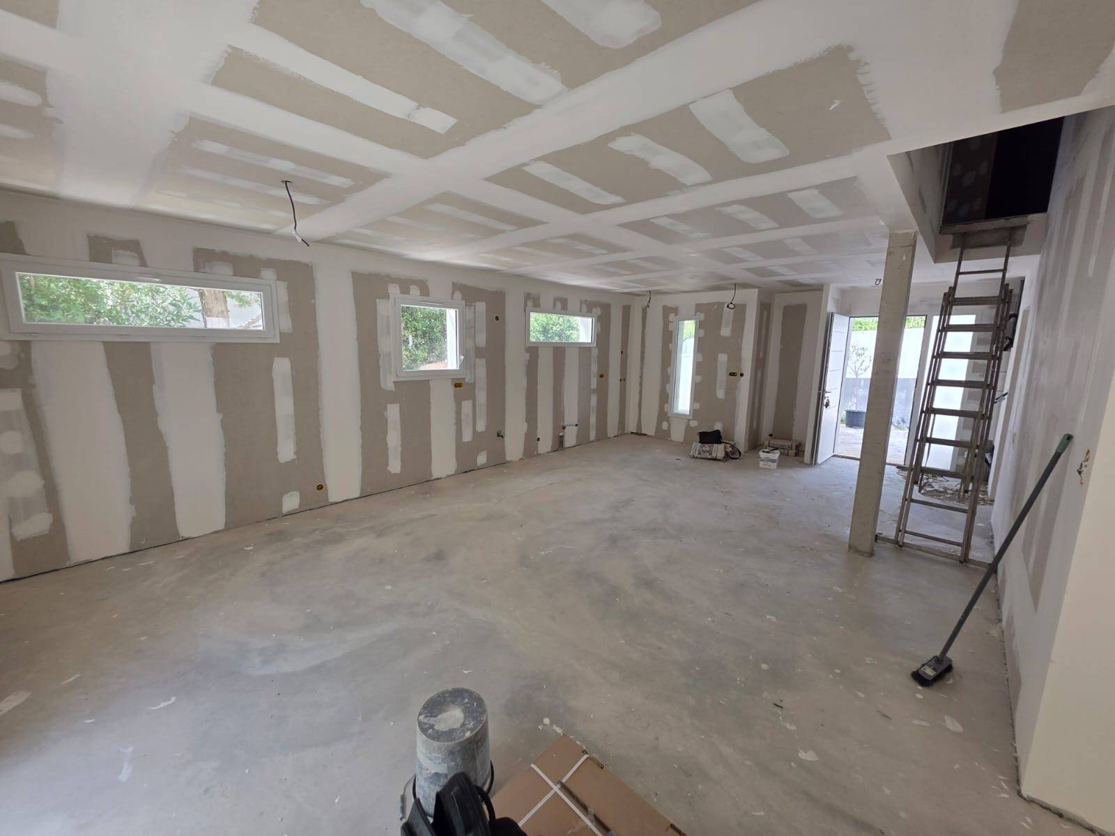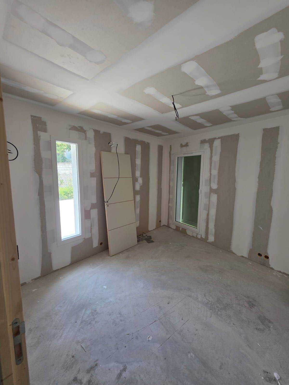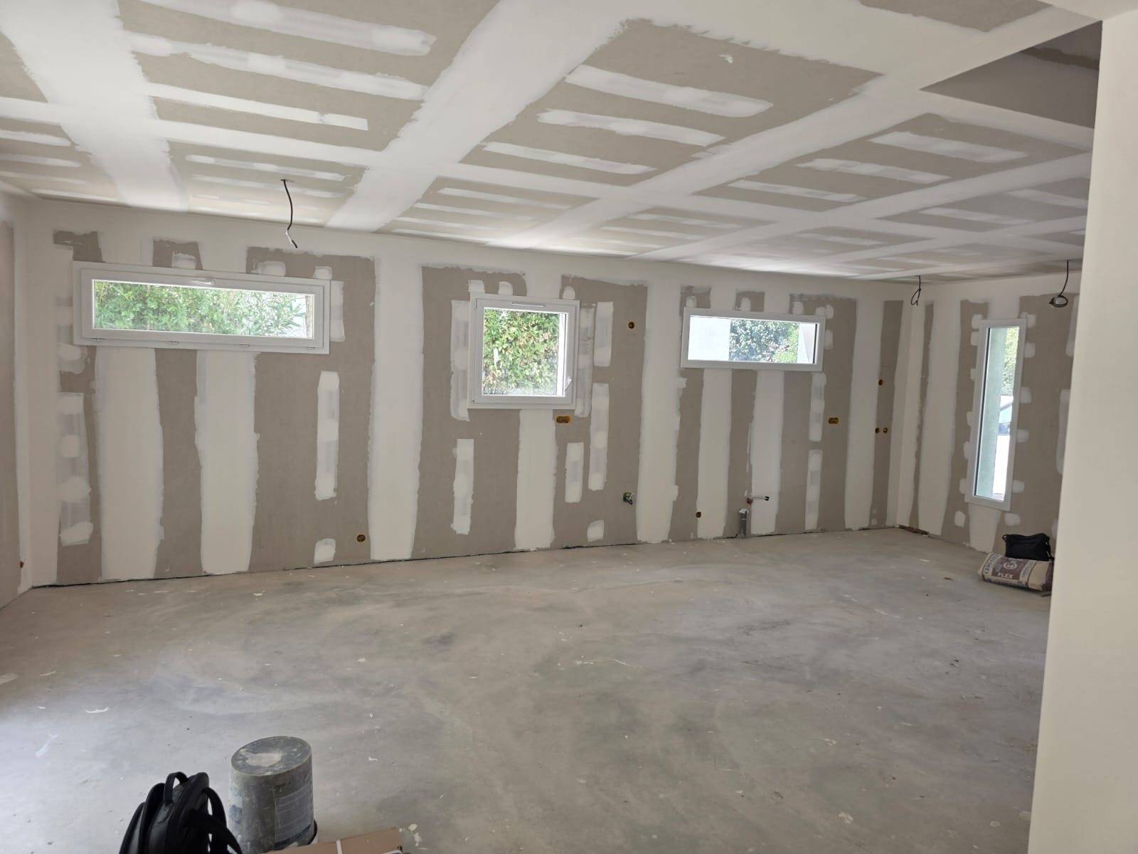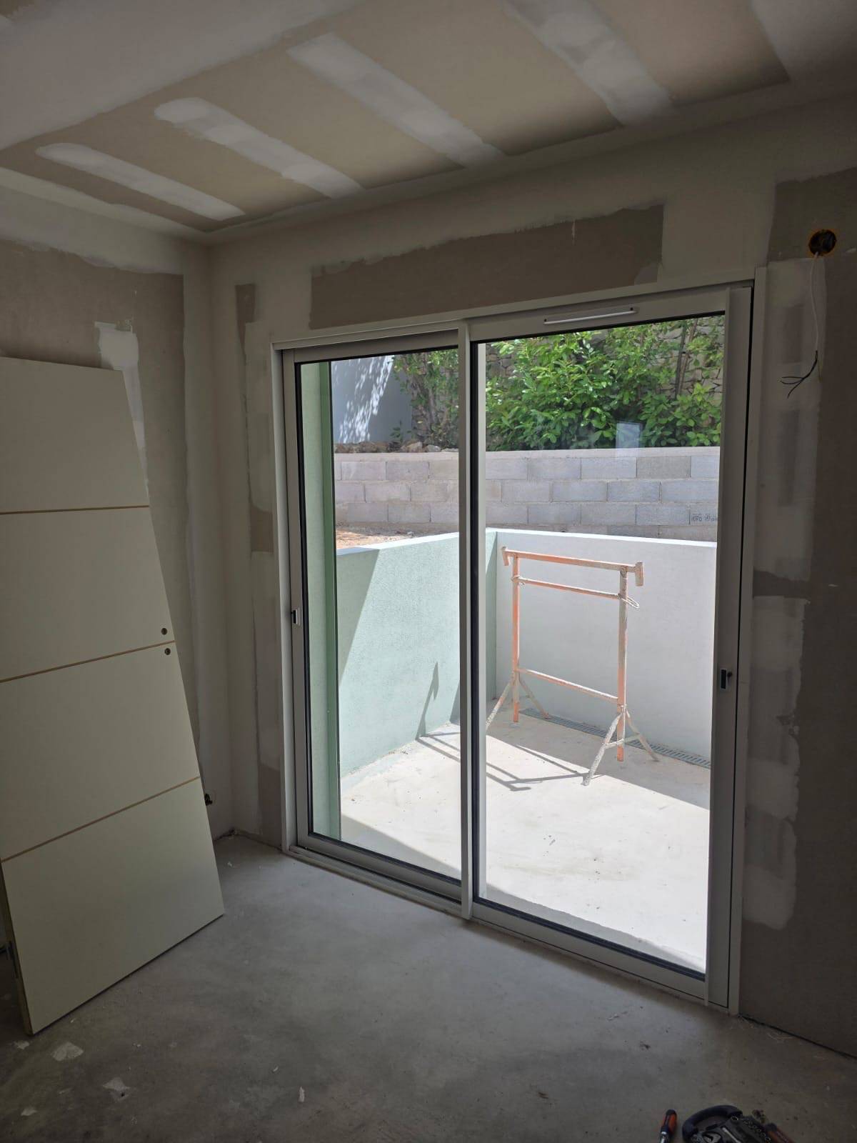 En complément de la fenêtre PVC, nous avons installé une baie vitrée coulissante en aluminium blanc. Ce choix s’explique par la finesse de l’aluminium, qui permet d’intégrer de larges vitrages et donc de maximiser la lumière naturelle à l’intérieur de l’habitat.