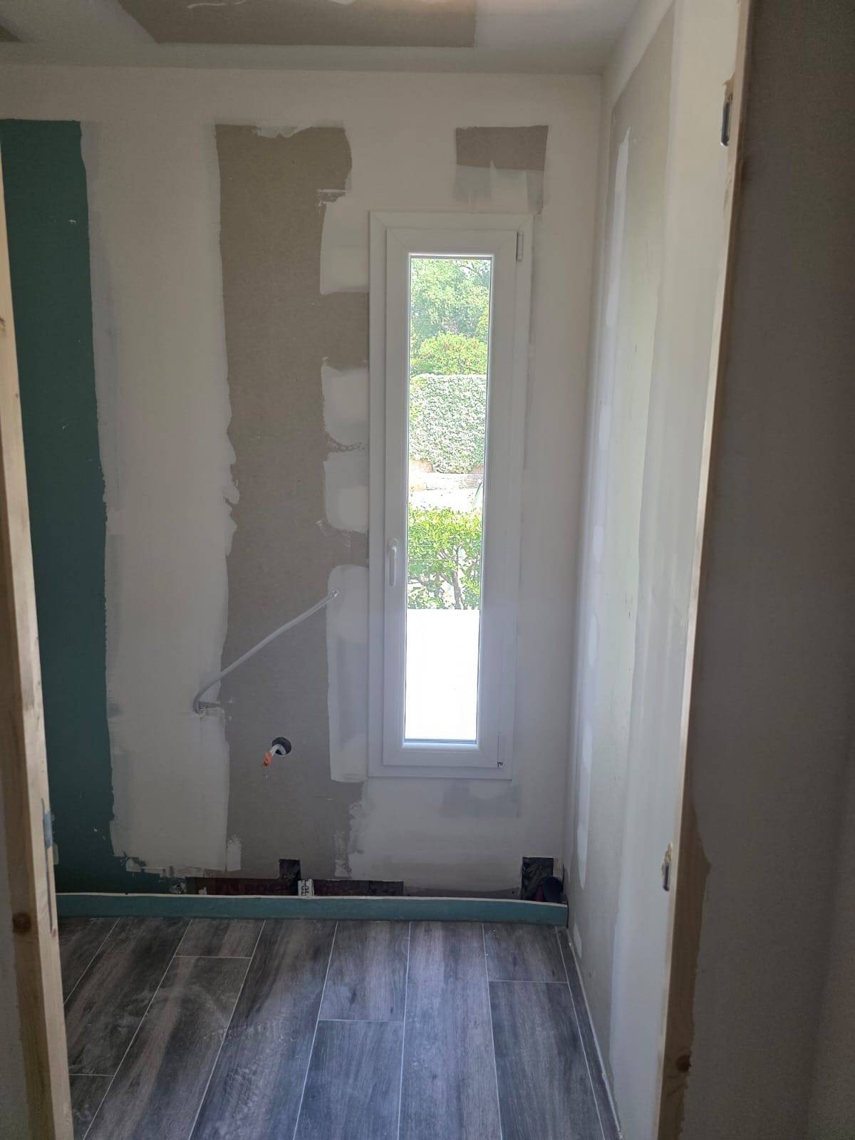 Dans cette pose de fenêtre blanche à Marseille, le choix d’une fenêtre PVC blanc ouvrant à la française s’est imposé comme une évidence. Ce type de menuiserie, très courant dans la région, garantit une excellente isolation thermique et phonique tout en étant résistant aux conditions climatiques méditerranéennes.
