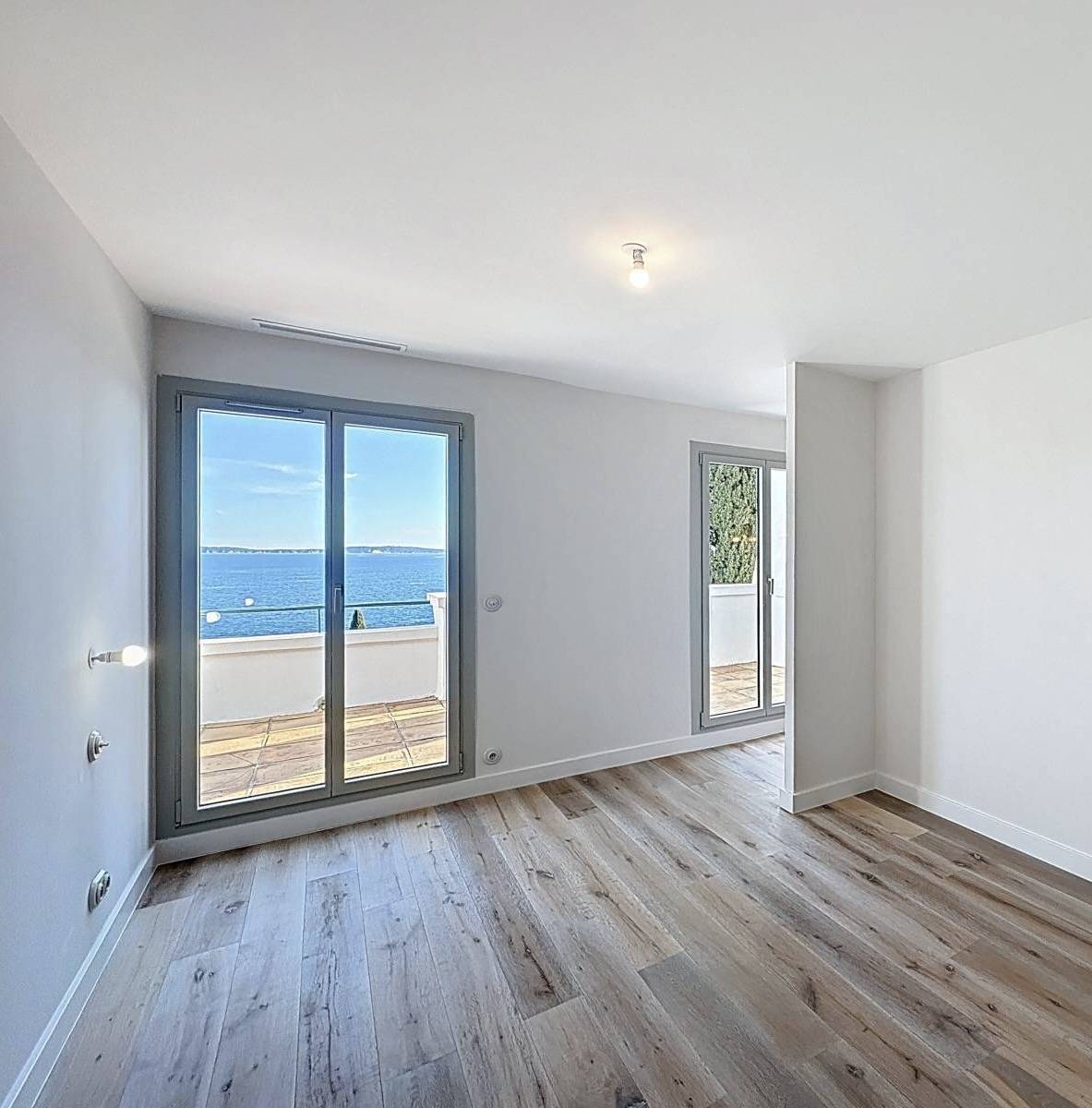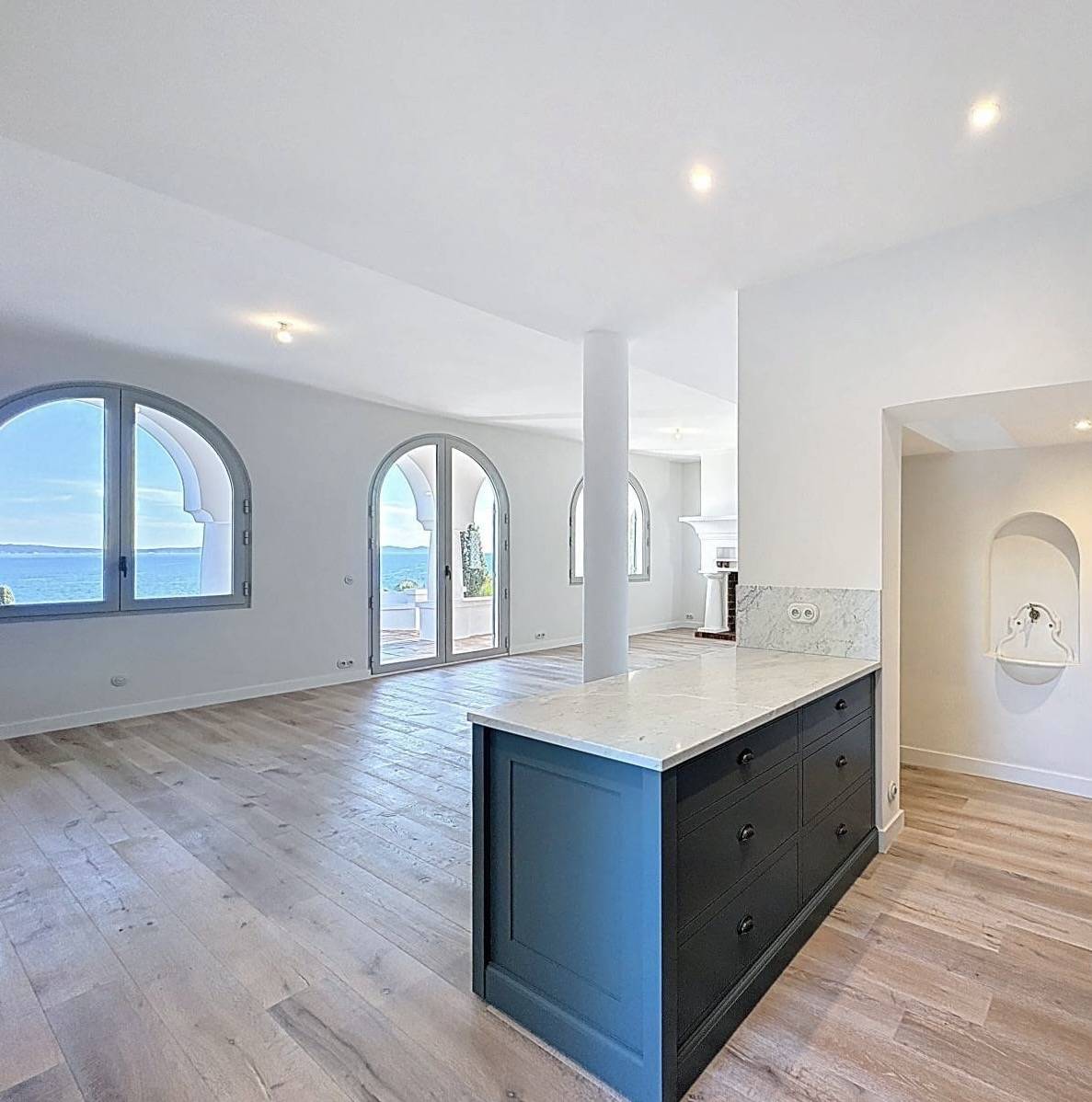 Les fenêtres en aluminium installées offrent une vue dégagée sur la mer, avec un maximum de lumière naturelle. La finesse des profils aluminium permet une grande surface vitrée tout en assurant une excellente isolation. Ces fenêtres, positionnées face à la Méditerranée, créent une belle continuité entre intérieur et extérieur, en harmonie avec le climat tropézien.