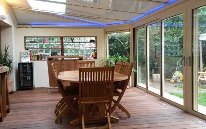La véranda sur mesure en aluminium laqué blanc ou tout autre coloris dans la palette RAL offre un style épuré et moderne, pour agrandir son lieu de vie, profiter du soleil toute l'année et gagner en luminosité.
